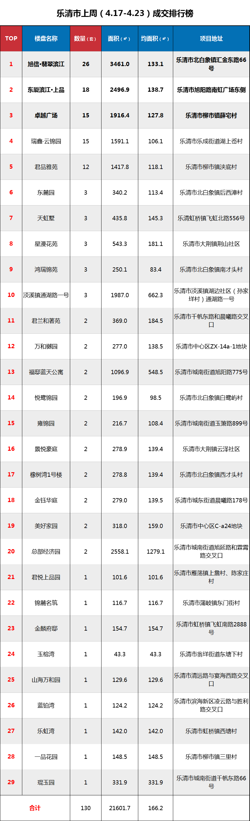 上周(4月17日—4月23日)乐清共计成交130套房源,成交总面积21601㎡,成交均面积约166㎡。