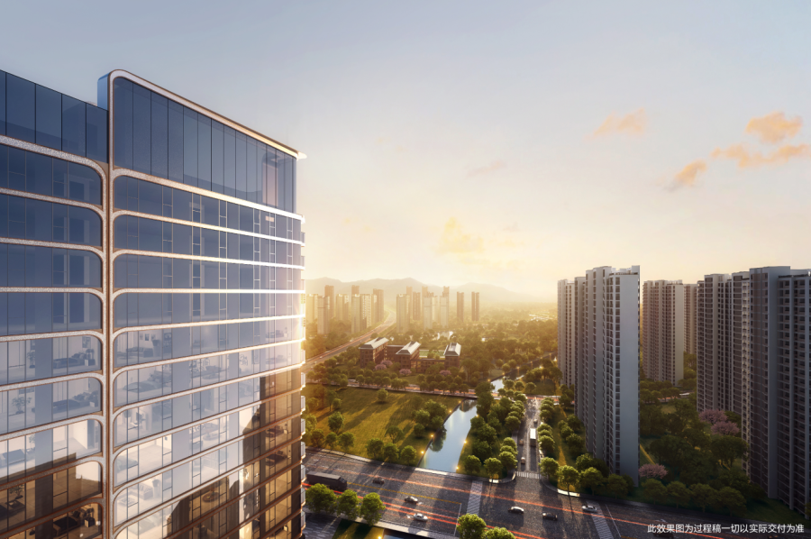 ◎流金曲面:以曲面环幕构建高层立面,金属铝板搭配大面玻璃造就270°环幕视野,灵动香槟金线条配以灰白铝板迭新审美,营造城市美学标杆。