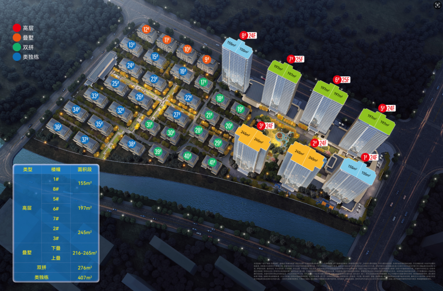 【产品类型】7幢高层(跃层)、4幢叠墅、12幢双拼、16幢类独栋