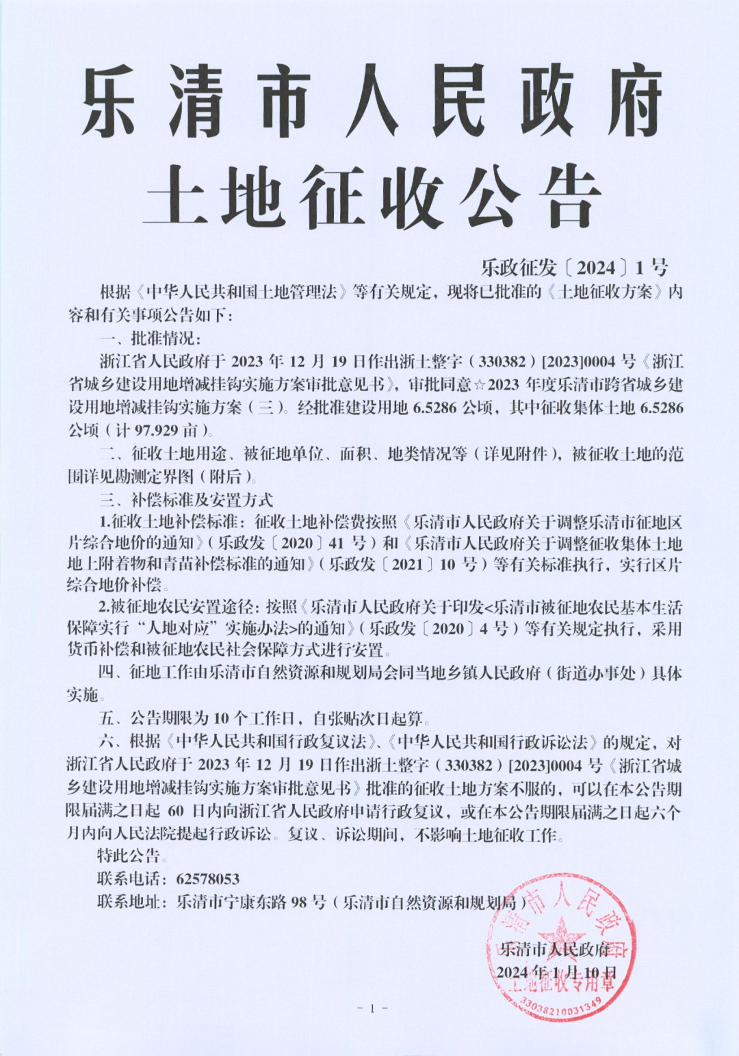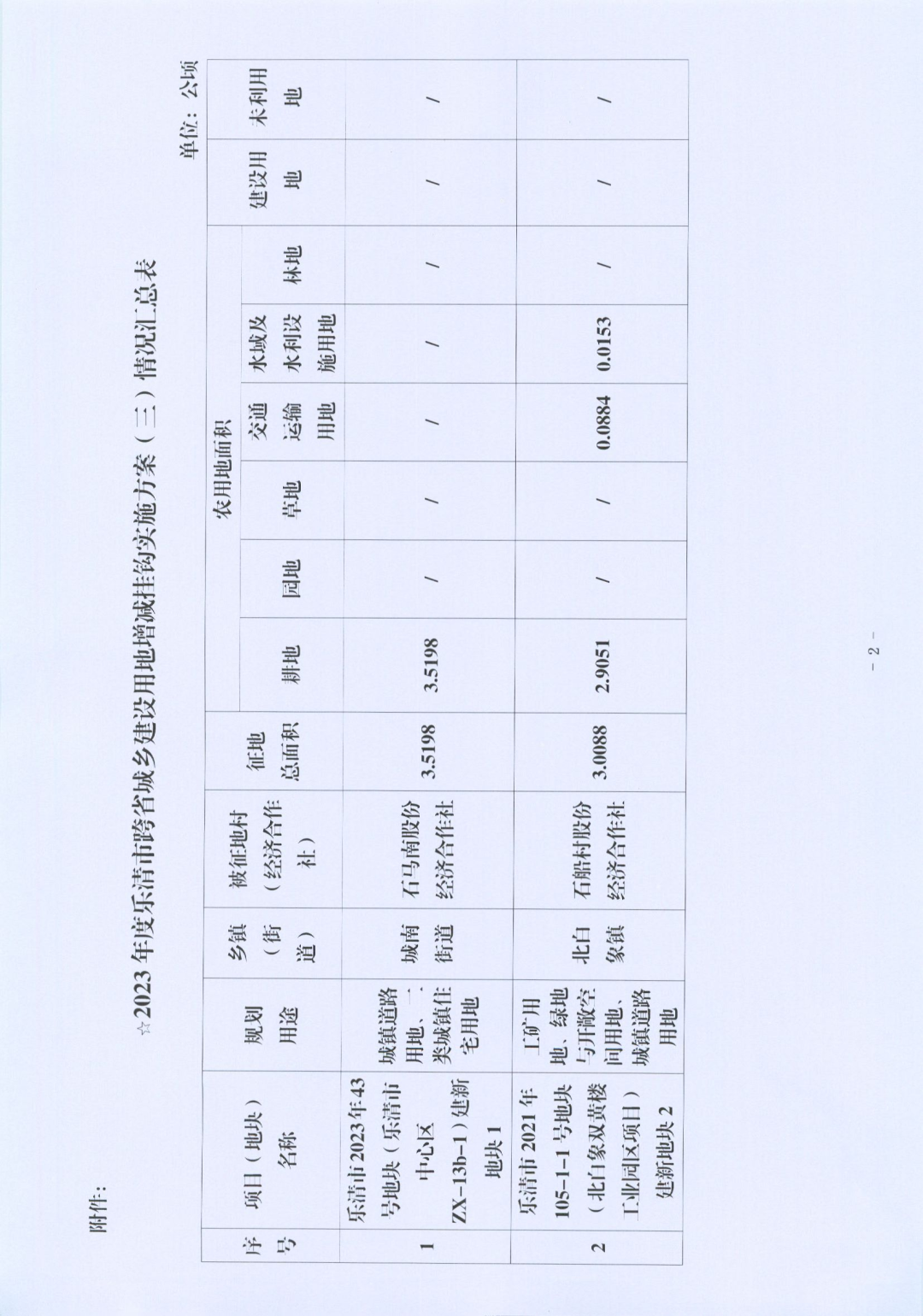 浙江省人民政府于2023年12月19日作出浙土整字(330382)[2023]0004号《浙江省城乡建设用地增减挂钩实施方案审批意见书》,审批同意☆2023年度乐清市跨省城乡建设用地增减挂钩实施方案(三)。经批准建设用地6.5286公顷,其中征收集体土地6.5286公顷(计97.929亩)。