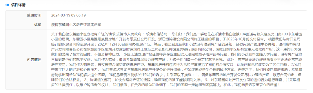 我们是一群居住在乐清市北白象镇104国道与塘兴路交叉口南100米东麓园小区的居民。东麓园小区是温州康桥房地产开发有限责任公司开发、浙江恒鸿建设有限公司施工建设的项目,于2023年10月份交付至今。根据我们与房开公司签订的购房合同约定房开应于2023年12月30日前可办理房产证。然而,截止到现在我们仍然没有收到房产证的通知,经咨询房产管理中心得知,温州康桥房地产开发有限责任公司在东麓园小区前期开发建设时违规将土地证二次延期抵押给嘉兴银行股份有限公司,造成目前小区所有业主无法取得产权,这一违约行为给我们的带来了极大的困扰、不便及精神压力。小区无法办理产权证使得许多业主因此无法完成孩子落户读书问题,我们的小孩即将面临入学问题,没有房产证将直接影响他们的就学权益。我们作为家长,迫切希望能够尽快办理房产证,为孩子们创造一个稳定的就学环境。此外,房产证无法办理意味着业主无法正常完成房产交易。我们作为购房者,有权按照合同约定获得房产证。东麓园房开的违约行为已经严重侵犯了我们的合法权益,此类问题已经转变为了民生问题,给我们带来了巨大的经济和心理压力。我们曾多次尝试与东麓园房地产开发公司进行沟通,但始终未能得到合理的解决方案。无奈之下,我们只能向政府求助,希望政府能够出面帮助我们解决这个问题。我们恳请贵方能够关注我们的诉求,并采取以下措施:1、督促东麓园房地产开发公司尽快办理房产证,履行合同约定,保障我们的合法权益。2、协调相关部门,加快办理房产证的流程,确保我们的孩子能够顺利入学。3、对东麓园房地产开发公司的违约行为进行调查,并采取相应的法律责任,以维护购房者的权益。我们相信,在贵方的帮助和协调下,我们的问题一定能得到圆满解决。在此,我们向贵方表示衷心的感谢!
