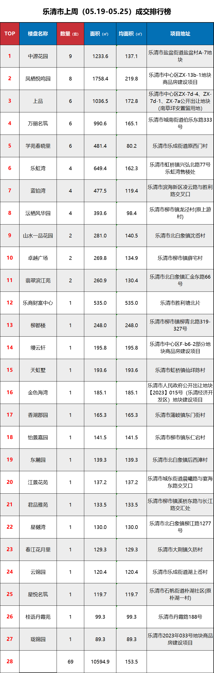 【5.19-5.25】乐清上周新房网签69套,数量与上上周持平
