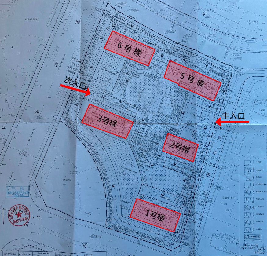 通过当时发布的 臻品嘉苑 楼栋的平面图我们可以看到这个小区中一共有5栋楼房,本期(1期)推出的2# 和 5# 刚好就在主入口的两侧,非常好区分;