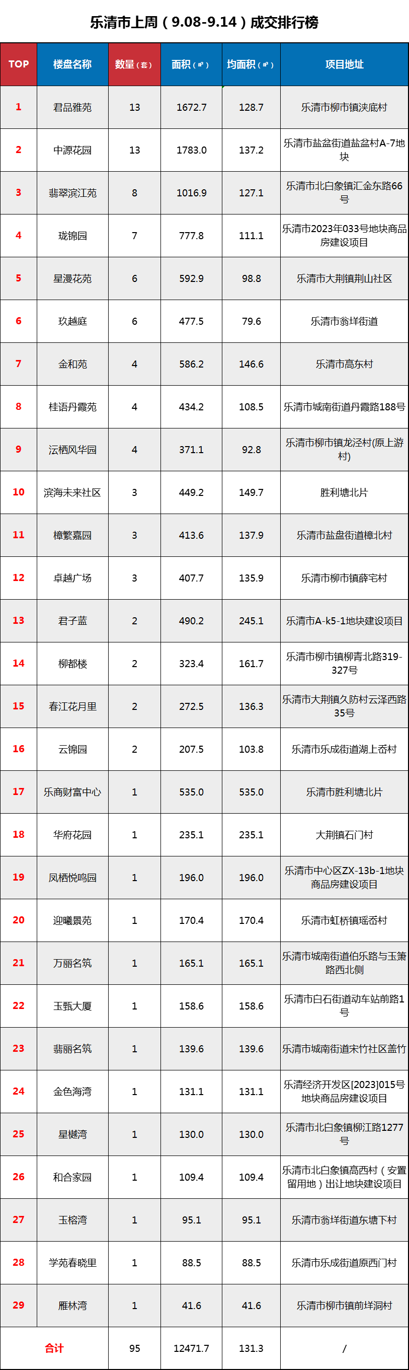 【9.08-9.14】乐清上周新房网签95套,君品雅苑、中源花园并列第一!