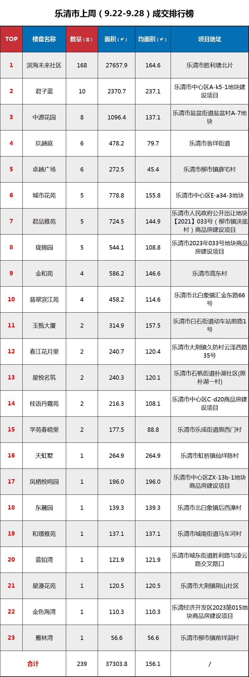 【9.22-9.28】乐清上周新房网签239套,滨海未来社区独占鳌头!