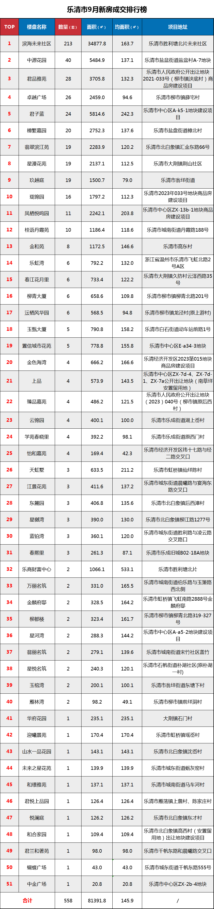 从成交来看,排名第一的是滨海未来社区,共计成交213套。该地块位于乐清市胜利塘北片核心位置(城东街道疏港公路以东,清东路南北两侧)。截至目前已开盘到八期,共有六个地块,现共有建面约105-300㎡的户型在售。上月成交均面积 163.7 m² ;排名第二的是中源花园,共计成交40套。中源花园位于乐清市盐盆街道盐盆村,已于2020年1月19日全部开盘,为安置房源,目前已竣工并达到现房状态。中源花园总用地面积为29087.66㎡,项目总建筑面积为132446㎡,绿地率约30%。上月成交均面积 137.1 m² 。排名第三的是新鸿·君品雅苑,共计成交28套。该项目为乐清柳市的住宅项目,项目周边规划有体育馆、湿地公园,距离现代广场直线距离约1.8公里(数据来源:百度测距)。上月去化率可观,在售面积段在89-170m²。上月成交均面积为132.3m² ;