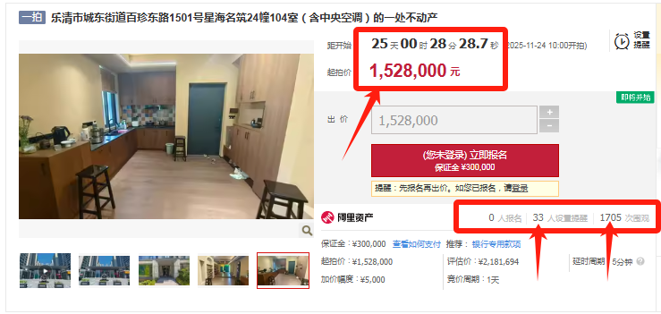 可以看到,本次拍卖的起拍价为152.8万元;距离拍卖时间还有25天时间,该房源截至目前共有33人设置提醒,已收到1705人次关注 。