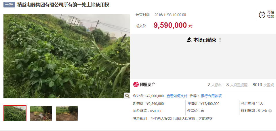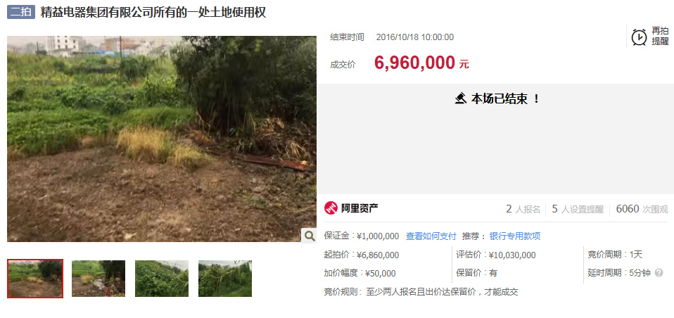2016年9月份,精益电器所有的两处土地使用权被上架拍卖,最后分别以959万、696万的价格拍出。