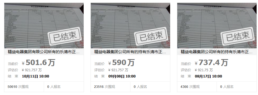 此后,同年10月份,精益电器所有的乐清市正泰小额贷款股份有限公司股权被挂牌拍卖,起拍价也是从737万降至501万,整整降了200多万。最后一次上架拍卖,有5万多次的围观,可以看出在当时也是引发外界的广泛关注,但依然因无人参与竞价而流拍。