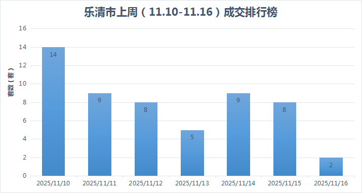 上周(11月10日—11月16日),乐清共计网签55套房源,网签总面积11831.5㎡,均面积约215.1㎡,从周成交量来看,成交套数比上一统计周期环比增长了约48%。