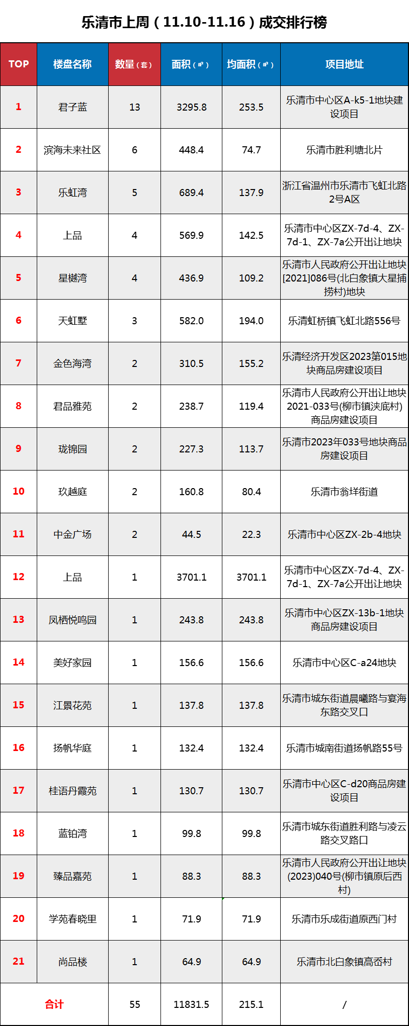 【11.10-11.16】乐清上周新房网签55套,销冠——绿城·君子蓝!