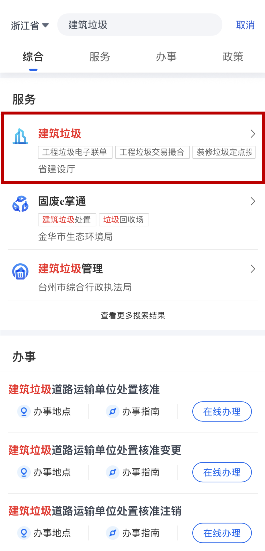 ① 登录“浙里办”,搜索找到“建筑垃圾”服务