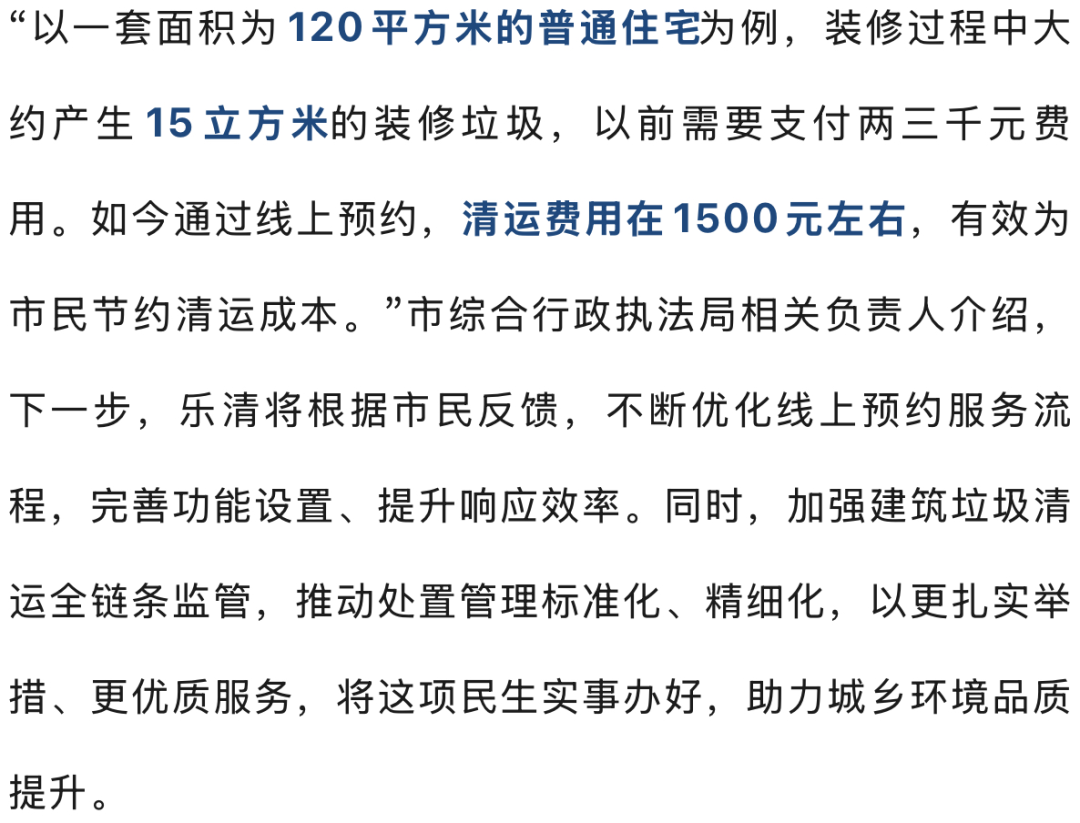 家住城东街道百珍东路附近的王先生成为首位体验者。当天15时许,他通过“浙里办”提交预约后,过了约1小时,清运车辆准时到达,将其家里约6立方米装修垃圾运走。“价格透明,共花费了630元,再不用为找清运车发愁了。”王先生满意地说。