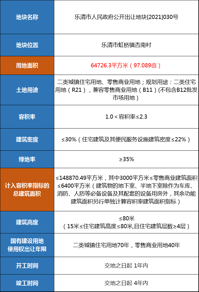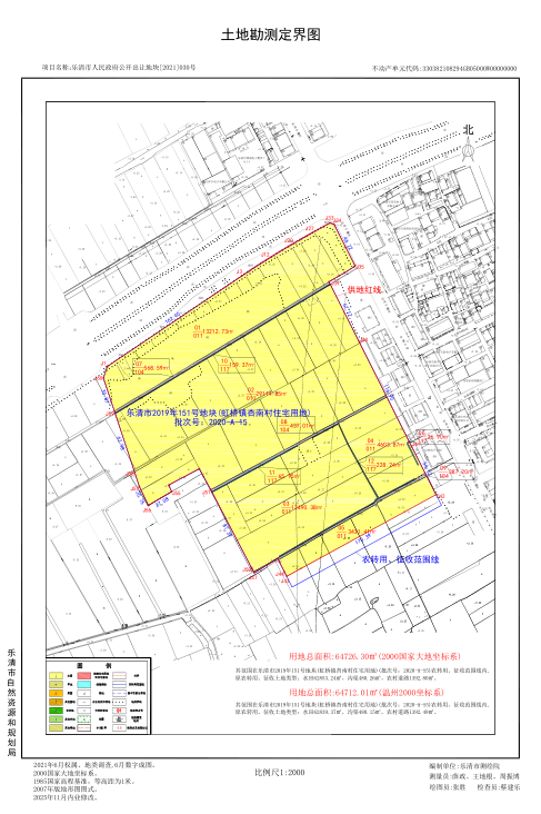 乐清市人民政府公开出让地块[2021]030号挂牌出让,该地块位于乐清市胜利塘北片乐清市虹桥镇杏南村,出让面积64726.3平方米(97.089亩),土地与规划用途为商品住房用地(二类),竞地起始价为50650万元,竞买保证金为10130万元,竞地价增价幅度为100万元,折合楼面价约为3402元/㎡ 。